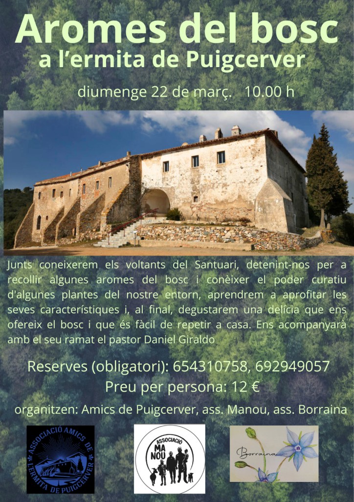 - 22 de març: Aromes del bosc a l’ermita de Puigcerver. Vine a gaudir dels voltants de l’ermita de Puigcerver, entre aromes de bosc amb demostració i degustació de com poder aprofitar-les. També tindrem el privilegi de l’acompanyament del pastor Daniel Girado amb el seu ramat de cabres. Us hi esperem!