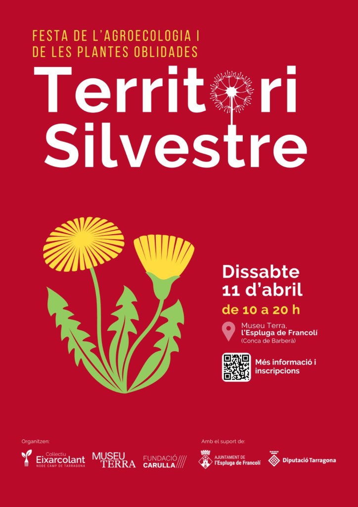 - 11 d’abril: Festa de l’agroecologia i de les plantes oblidades. Territori Silvestre. Vine a gaudir de la 4a. edició al Museu Terra de l’Espluga de Francolí. Allà hi trobareu tallers per a tots els públics, sortides etnobotàniques, demostracions de cuina, fira agroecològica i d’entitats, passis de cinema, música en viu i molt més. I no us oblideu de venir a saludar-nos a la nostra parada on, com sempre, oferirem menges vegetals i silvestres!